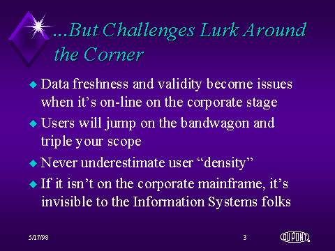 * The owner of your source worksheet will not be able to run a mailmerge, save the resulting file as ASCII text, and FTP the file to their web site. On the other hand, the IS folks will not support or assist end users with simple spreadsheets. Although your application may have global utility, it can easily fall through the cracks. Then you get stuck doing simple database maintenance for the rest of your life.
